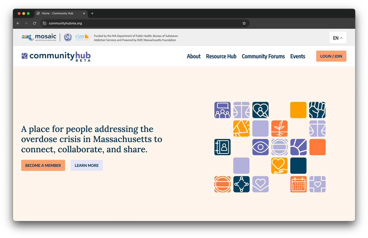 Mosaic’s Community Hub is a free, statewide platform created for organizations, municipalities, state agencies, and individuals working to address the overdose crisis in Massachusetts. The platform makes it easy to share resources, highlight needs and opportunities, and connect with others doing this work. The Community Hub helps users find and post funding opportunities, job openings, events, publications, and information about current and promising interventions, services, and programs.