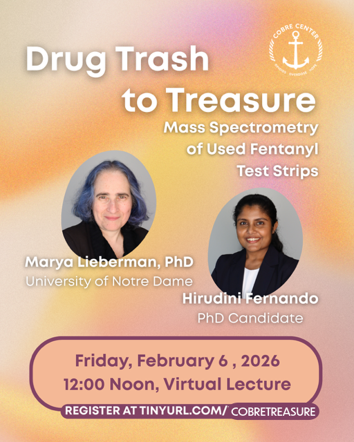 The Center for Biomedical Research Excellence (COBRE) on Opioids and Overdose has an exciting upcoming webinar! COBRE is excited to have Marya Lieberman, PhD and Hirudini Fernando, PhD Candidate, both with the University of Notre Dame, join us for a guest lecture to share their cutting-edge research into fentanyl test strip extraction.