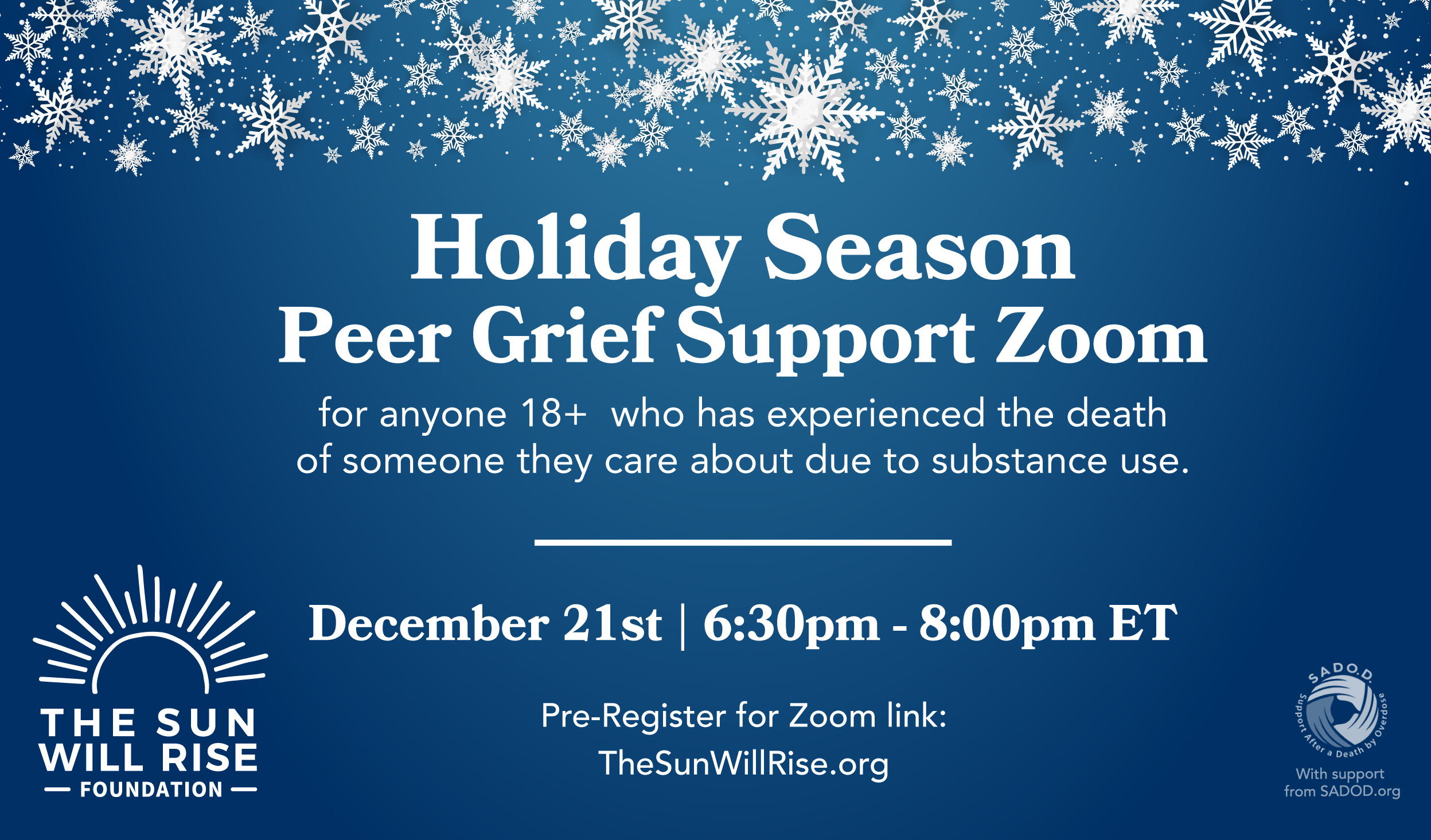 The Sun Will Rise Holiday Peer Grief Support Group for those 18 and older bereaved due to a substance use related cause seeking extra peer grief support this holiday season.