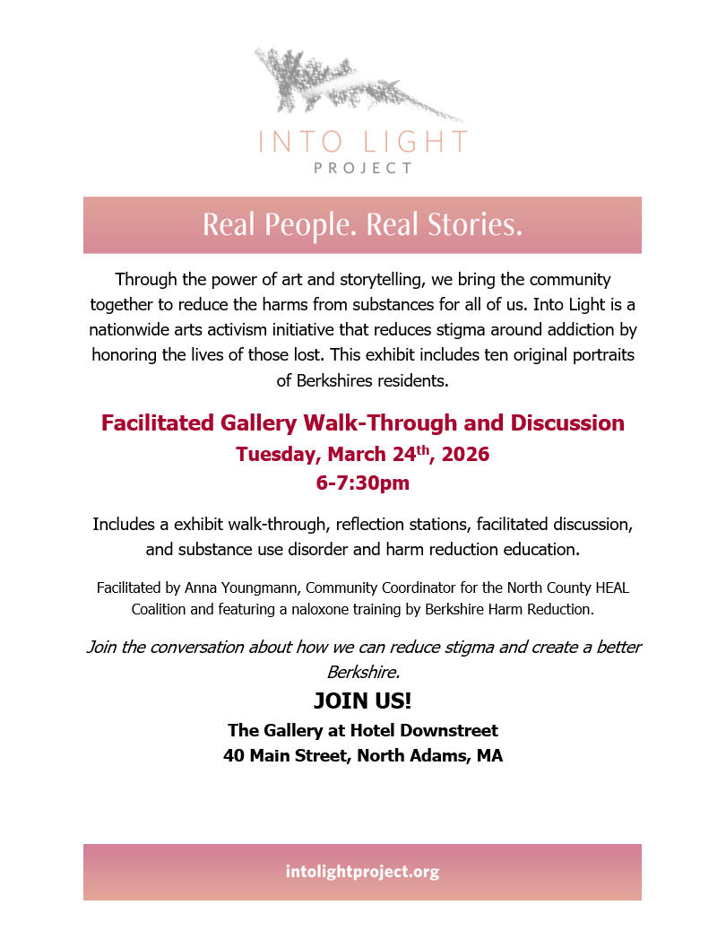 Through the power of art and storytelling, we bring the community together to reduce the harms from substances for all of us. Into Light Project is a nationwide arts activism initiative that reduces stigma around addiction by honoring the lives of those lost. This exhibit includes ten original portraits of Berkshires residents.