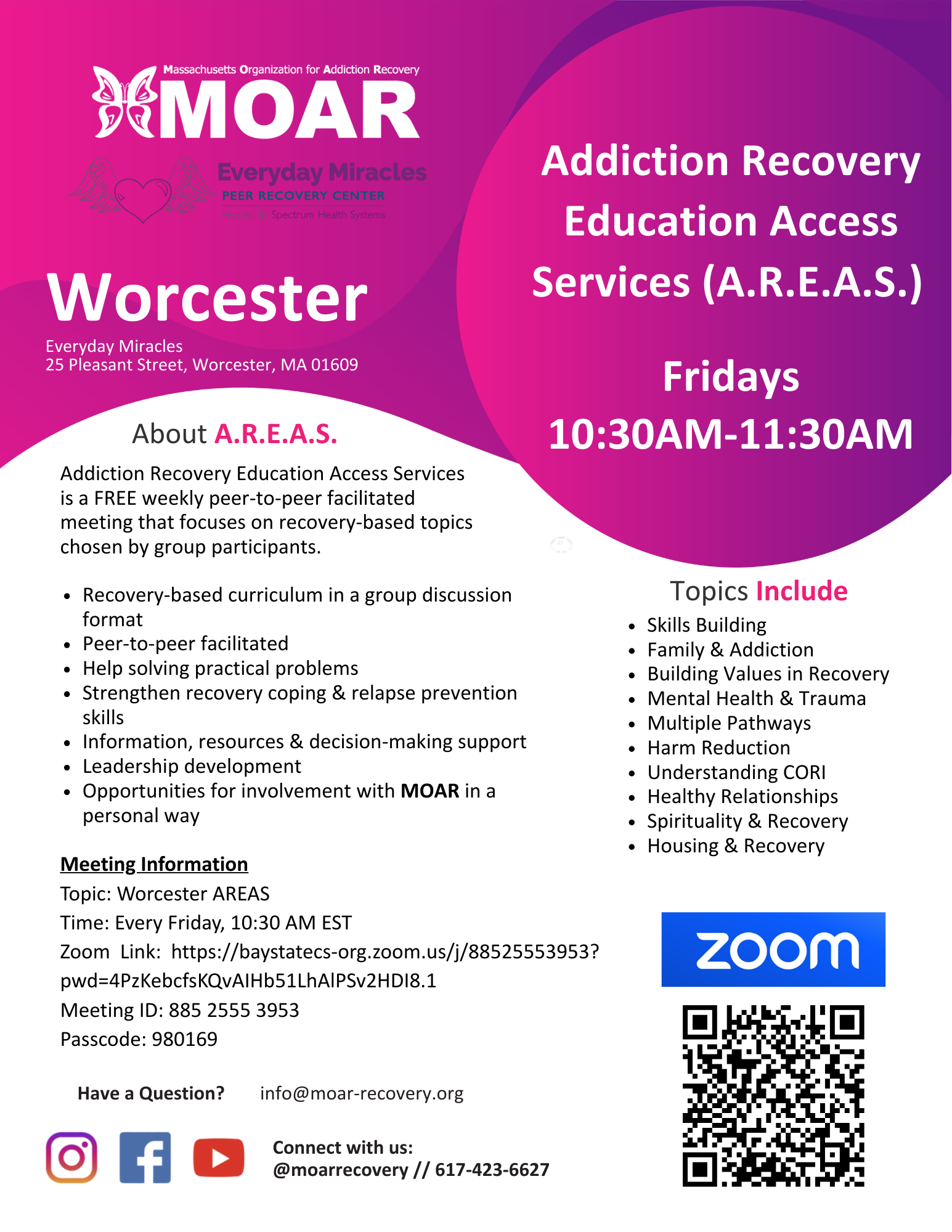 Addiction Recovery Education Access Services is a FREE weekly peer-to-peer facilitated meeting that focuses on recovery-based topics chosen by group participants.